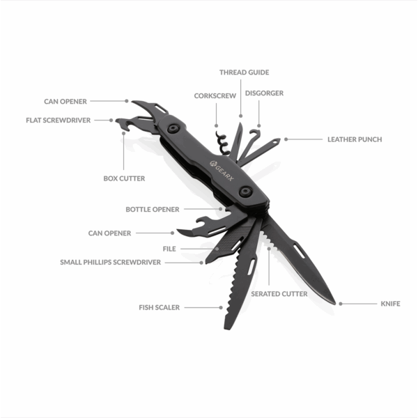 Mezi 13 funkcí patří: nůž, pila, plochý šroubovák, otvírák na konzervy, pilník, malý křížový šroubovák, vývrtka, vodítko nitě, děrovač na kůži, řezač krabic, otvírák na lahve a malá čepel.